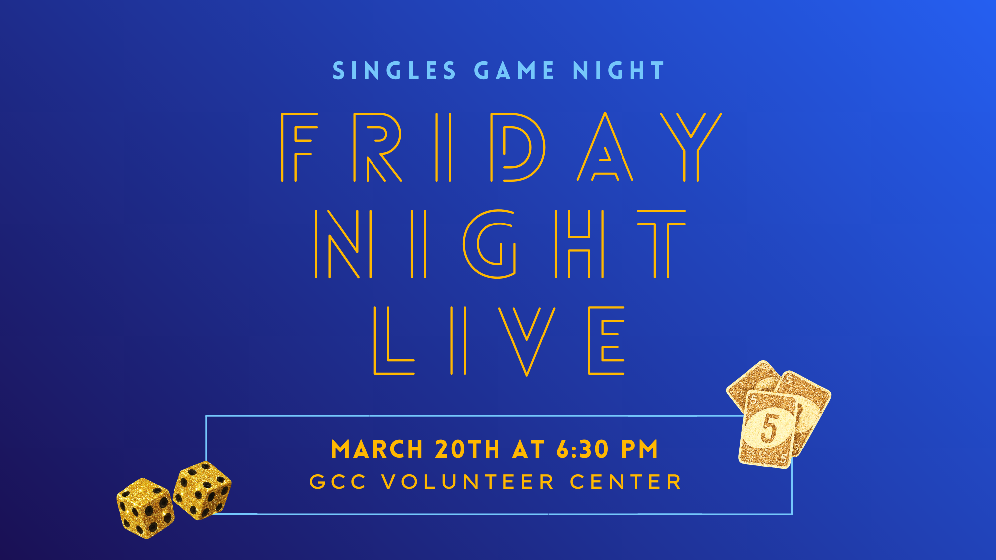 We are gathering together for a singles game night in the Volunteer Center at the church on March 20th! Would love to see you there!