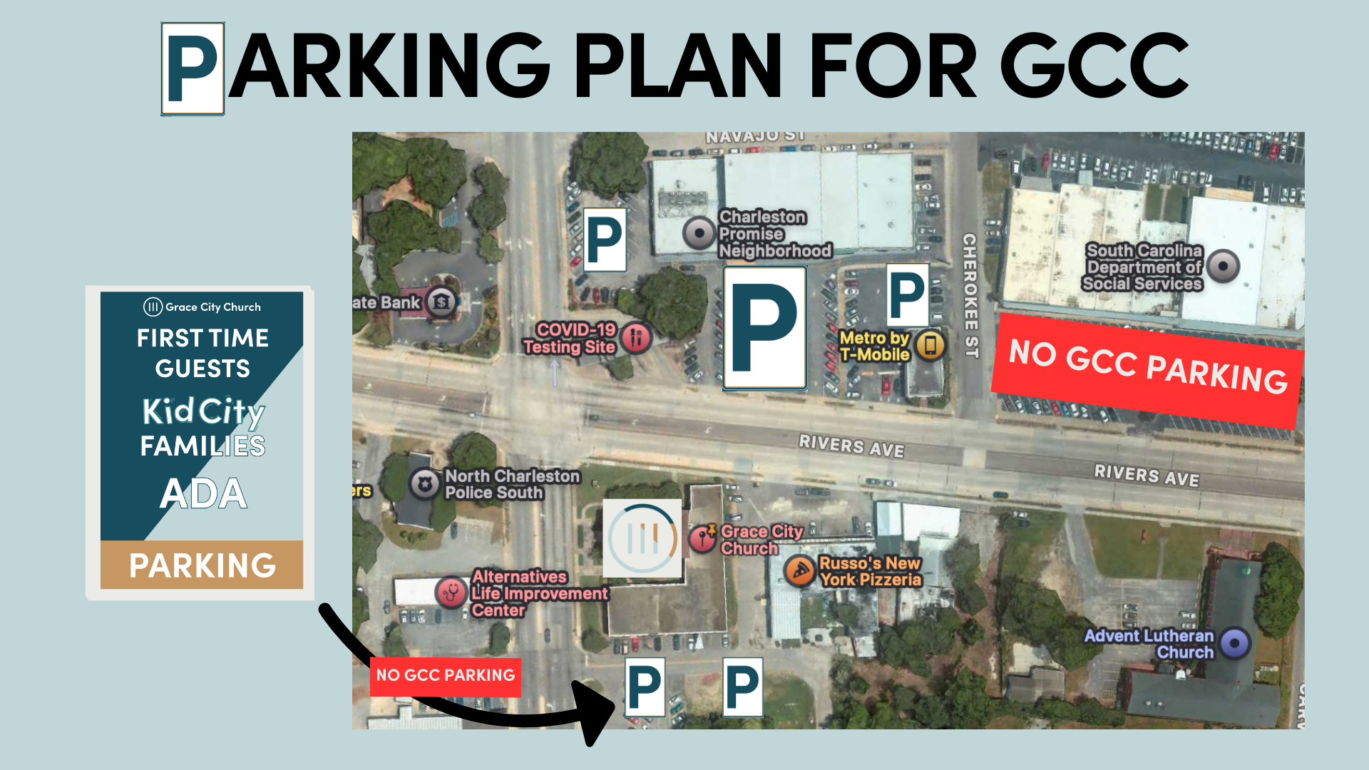We're excited to worship together at our new long term space addressed at 2105 Cosgrove Ave. We will be utilizing the parking lots of Neighbors Together, and the lot directly across Rivers Avenue as well. Please utilize the diagram below laying out the parking plan for our Sunday morning gatherings. If you need assistance entering the building, please find a parking attendant in a yellow vest, and they will be happy to guide you in.